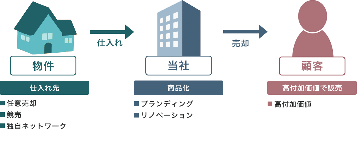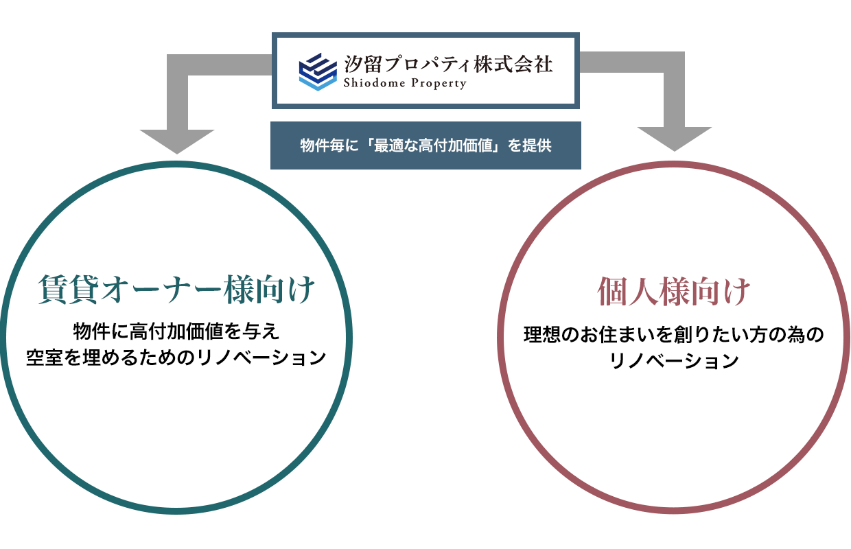 当社では、任意売却・競売・独自ネットワークにて仕入れた物件に対し、リノベーションを行うことによって、物件にプラスαで付加価値を加え、リノベーション物件として販売しております。